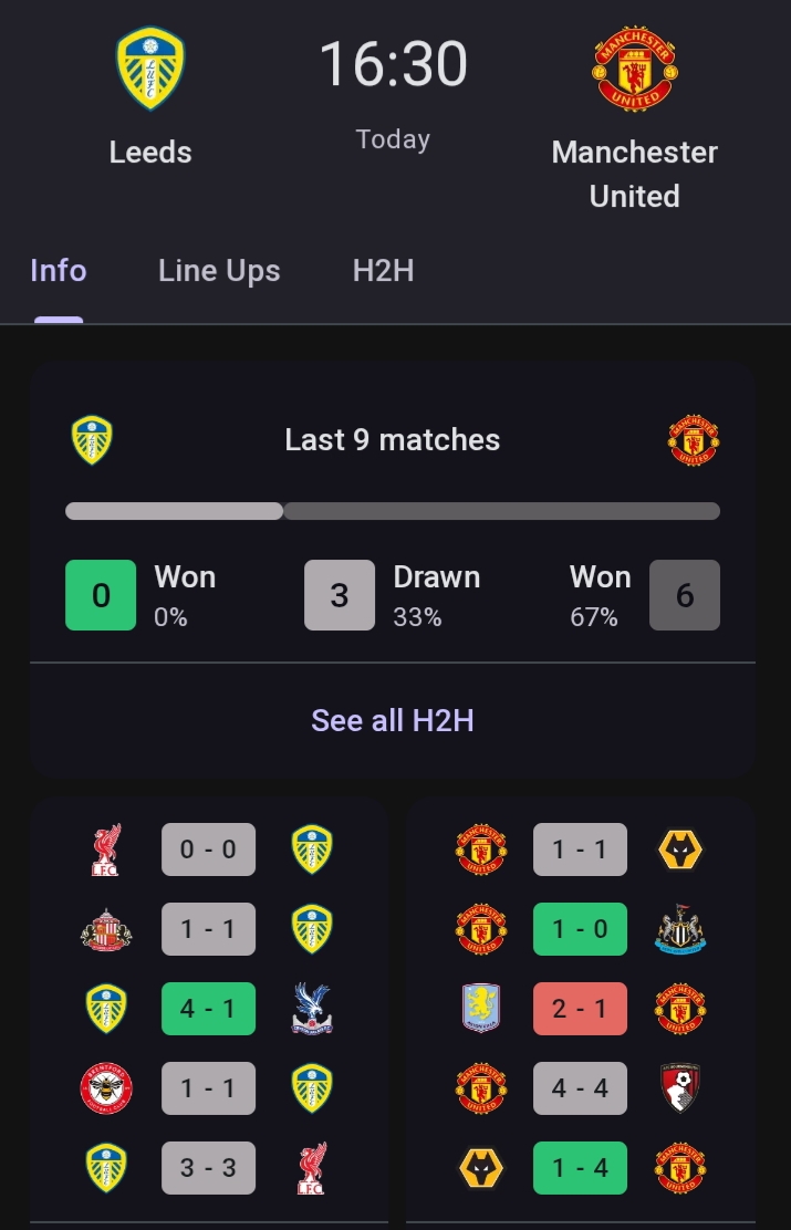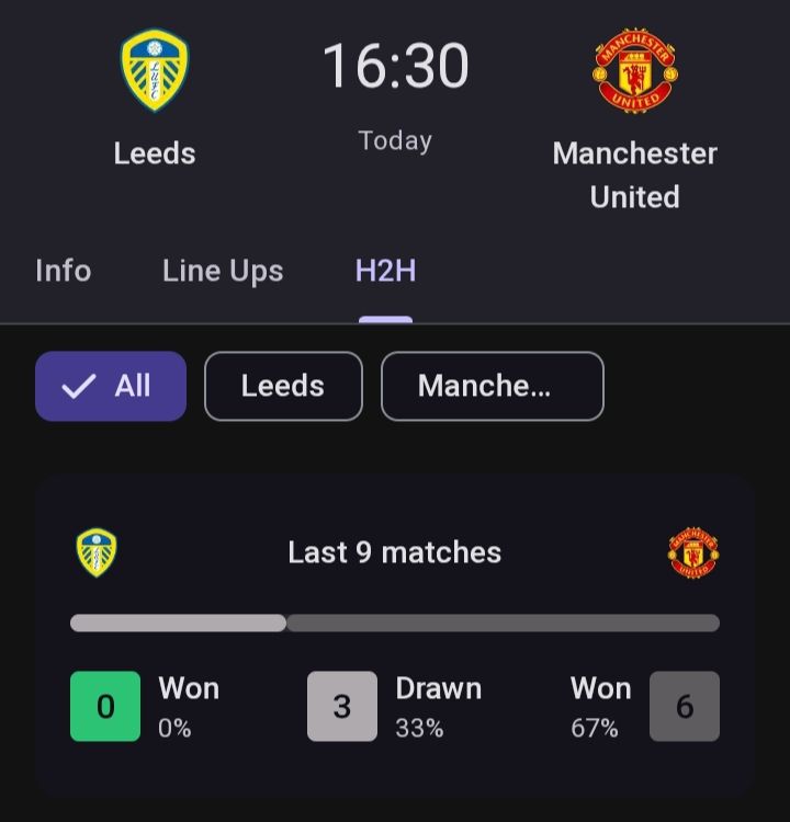 Head-to-head record (all competitions): Manchester United dominate with ~50 wins, Leeds ~26, and many draws (out of 113+ matches). In the Premier League, United have lost only 4 times to Leeds.