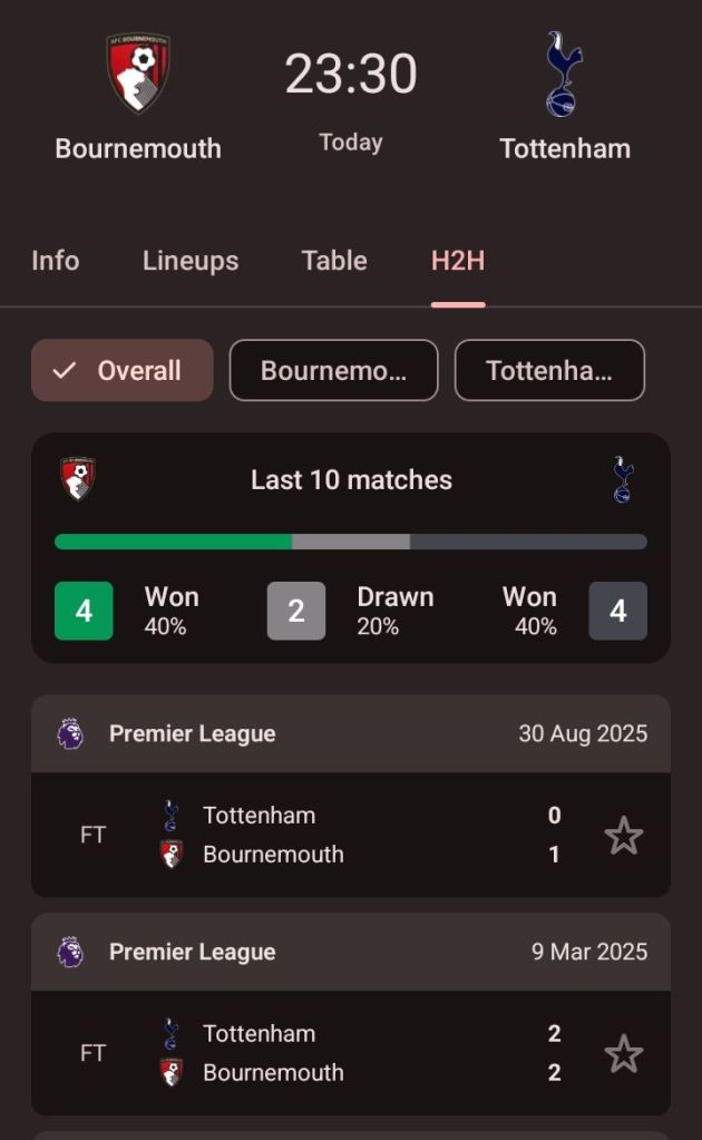 Bournemouth won the reverse fixture earlier this season (1-0 at Tottenham), so they’re aiming for their first-ever Premier League double over Spurs.